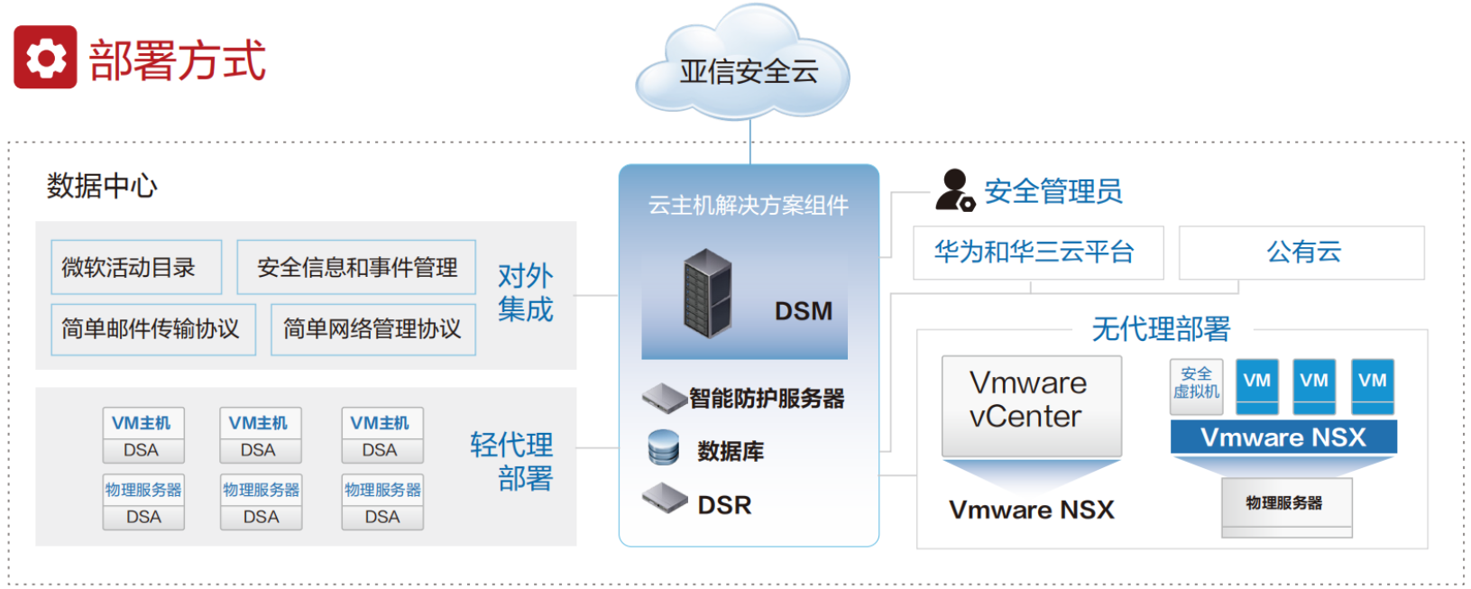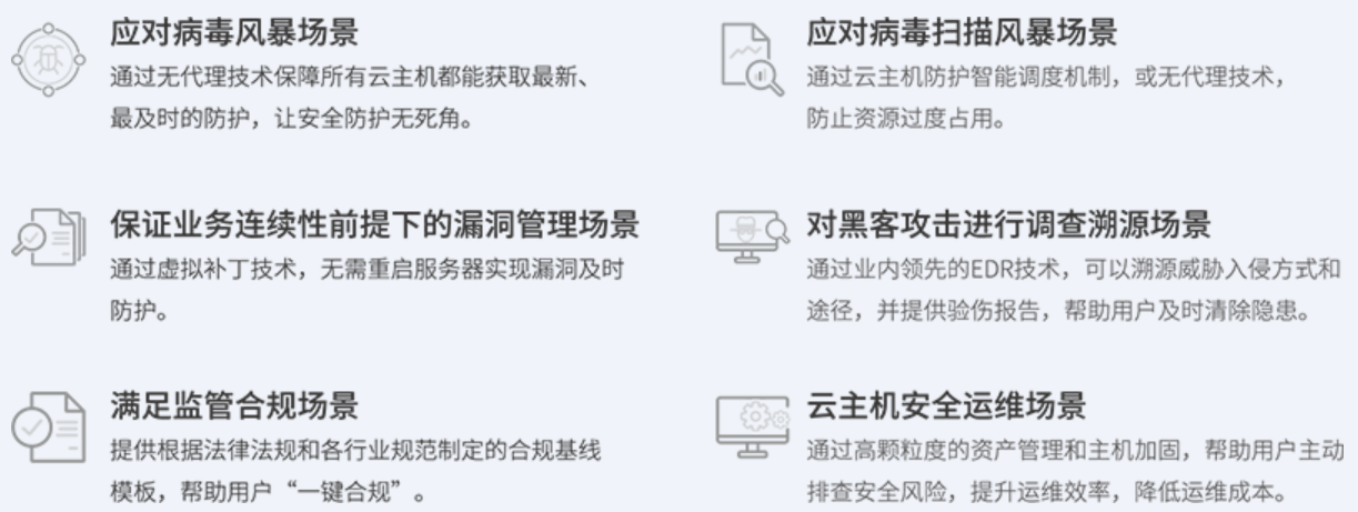 降低病毒查杀时的资源占用、提供虚拟机启动间隙的安全防护、广泛的无代理平台支持。