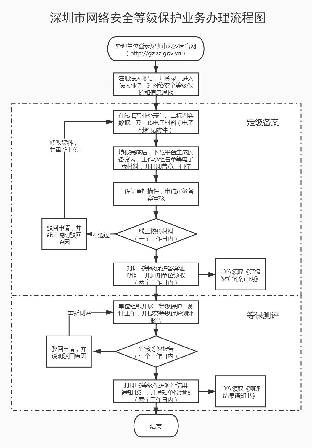 等保2.0定级备案流程:确定定级对象、初步确定等级、专家评审、主管部门审核、公安机关备案审查、最终确定等级。